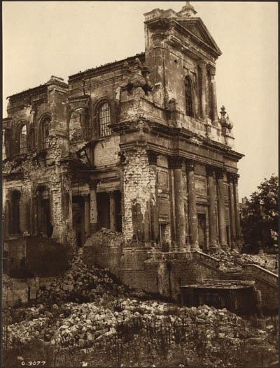 L'entrée principale de la cathédrale d'Arras montrant le toit complètement arraché et les escaliers en ruines