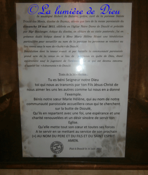 Suite aux déclarations faites le 29 mai 2011 lors de la messe en l'église de Dozulé, le nouvel évêque de Bayeux-Lisieux, Mgr Jean-Claude Boulanger, a confié à Mme