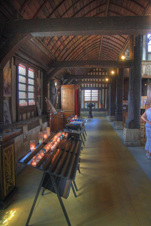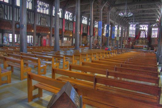 Intérieur : gauche, nef en bateau du XVe siècle ; droite, nef du XVIe siècle