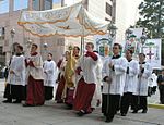 la procession de la Fête-Dieu, le prêtre porte l’Eucharistie dans