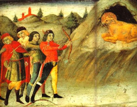 Le Miracle de saint Michel au mont Gargan. « Furieux, il lança contre lui une flèche empoisonnée, mais celle-ci, comme repoussée par le vent, se retourna vers lui et le frappa lui-même. »