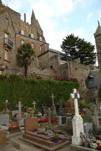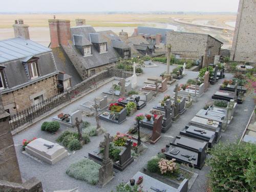 Côté nord, près des marches permettant l'accès à la parcelle haute du cimetière, se dresse un monument aux morts de la Première Guerre mondiale avec l'inscription « Aux enfants du Mont-Saint-Michel morts pour la France, qu'ils reposent en paix. ». Y figurent huit noms.