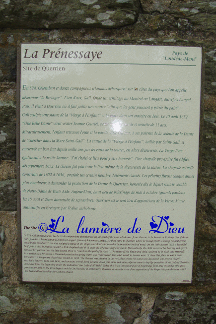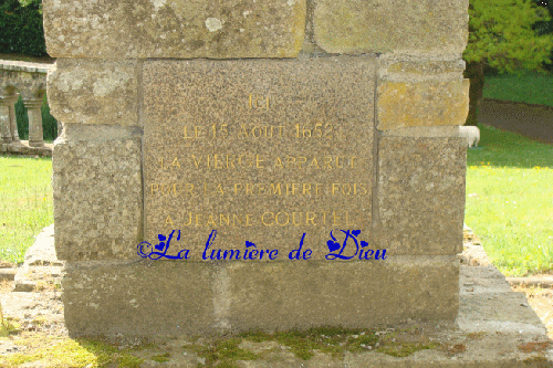 Le 20 août 1652, la Vierge demande à Jeanne Courtel de creuser à l'endroit qu'on nomme "La Mare", près de la chapelle actuelle pour trouver une '"image" ou statue. Un des habitants aurait mis au jour une image ni mouillée, ni salie.