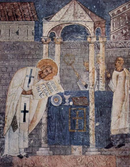 Fresque de la Cathédrale d'Ohrid, représentant saint Basile pendant la consécration de la Divine Liturgie, qui porte son nom