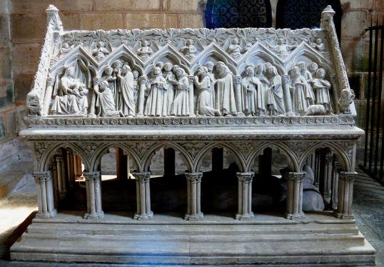 Son corps est "enfermé dans un sarcophage en pierre et enseveli dans la salle capitulaire, en attendant que se termine la grande église et qu'on ait consacré à ses reliques le splendide monument que lui réserve le XIIIe siècle".
