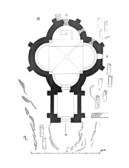 quatre absides semi-circulaires voûtées en cul-de-four s’articulent sur