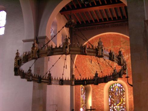 - le lustre d’Hettilo, un lustre en couronne du XIe siècle (dans le transept, figurant la Jérusalem céleste)