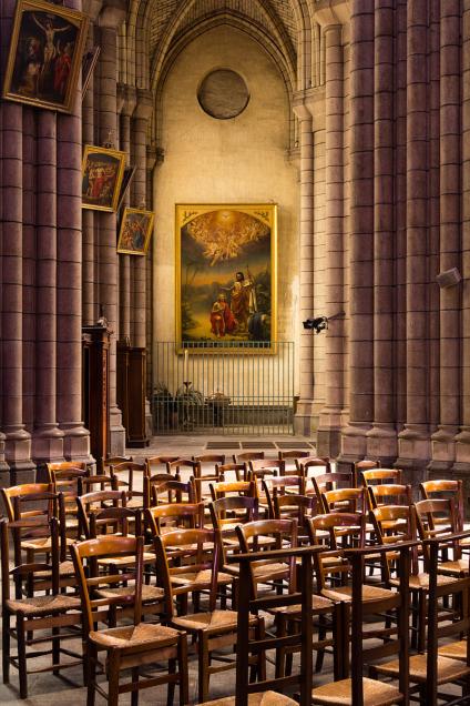 La nef, de trois travées, est accostée de collatéraux favorisant une circulation aisée au cours des liturgies, en rapport avec une paroisse populeuse et urbaine.
