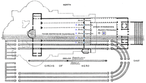Situation de la Basilique actuelle par rapport à la basilique constantinienne et au Circus VaticanusAu Ve siècle, le pape Symmaque y fit construire une résidence dans laquelle quelques personnages illustres vinrent séjourner, tel Charlemagne lors de son couronnement (800). Au XIIe siècle, Célestin II, puis Innocent III la firent rénover. La construction du Palais du Vatican débuta sous le pontificat de Nicolas V durant la première moitié du XVe siècle.