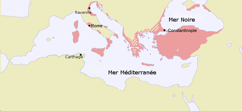 - au-delà des Alpes, le royaume des Lombards, les États pontificaux (créés par Pépin le Bref), le duché lombard de Bénévent, les possessions byzantines (Naples, Pouilles, Calabre) ; mais Byzance a dû laisser l'exarchat de Ravenne tomber aux mains des Lombards en 751 ;