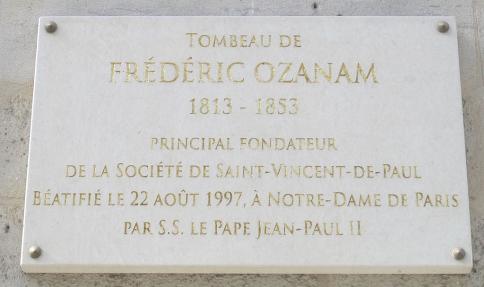 Une plaque commémorant les premières réunions de la Société de Saint-Vincent-de-Paul est apposée sur la façade d'un immeuble situé à gauche de l'église Saint-Sulpice, à Paris. De même, à l'entrée de l'église Saint-Joseph-des-Carmes au 70, rue de Vaugirard, une plaque, posée en 2013, année du bicentenaire de sa naissance, rappelle que Frédéric Ozanam est enterré dans la crypte de cette église.