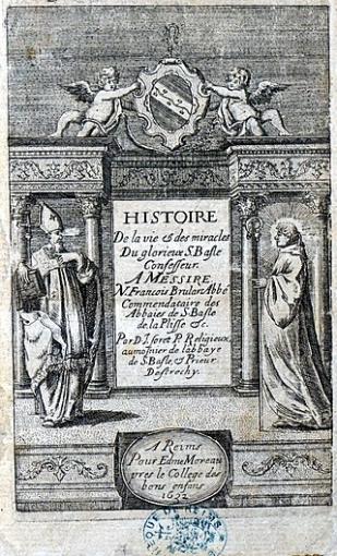 Une vie de St-Basle dédicacé à Nicolas Brulart de Sillery de 1632, il est alors abbé de Verzy, bibliothèque Carnegie (Reims)