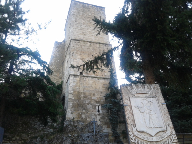 Le clocher de l'église de San Berardo di Pescina avec un bas-relief du saint à côté