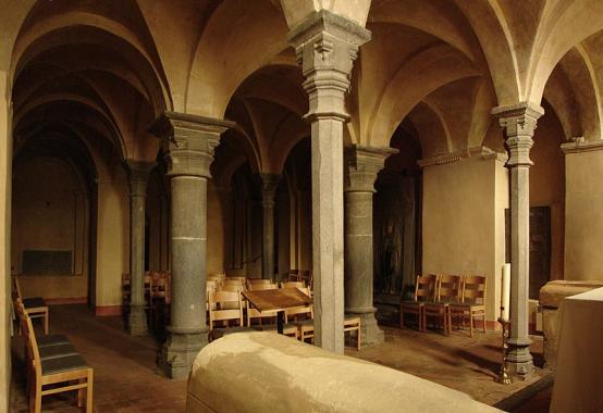 Le sarcophage de saint Ermin (avant-plan) dans la crypte de Saint-Ursmer, à Lobbes