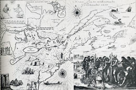 Carte de Nouvelle France des Jésuites de 1657, avec la représentation de la mise à mort de Jean de Brébeuf et de Gabriel Lalemant par les Iroquois