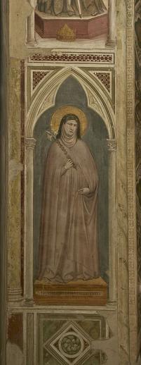Claire d'Assise est représentée dans la robe de bure franciscaine et la cordelière à trois nœuds.