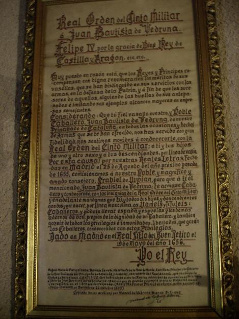 L'octroi par arrêté royal de l'« anoblissement de Juan Bautista » citoyen de Vedruna (et tous les descendants des deux sexes), ancêtre direct de sainte Joaquina Vedruna de par le roi Philippe IV en 1656