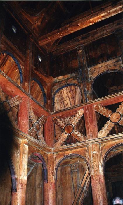 L'église est de catégorie d'églises en bois debout avec étage. Elle a un chœur avec abside semi-circulaire, aussi avec étage, et est entourée d’une galerie extérieure couverte.