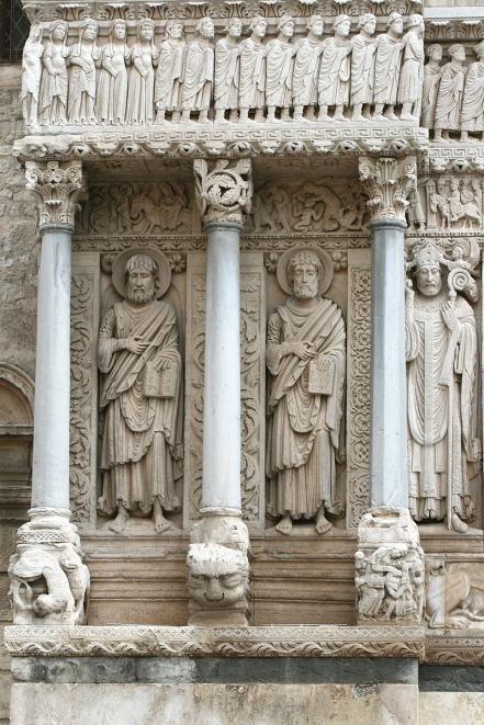 Portail de Saint-Trophime à Arles ; panneau de gauche avec de gauche à droite : saint Barthélemy, saint Jacques le Majeur et saint Trophime