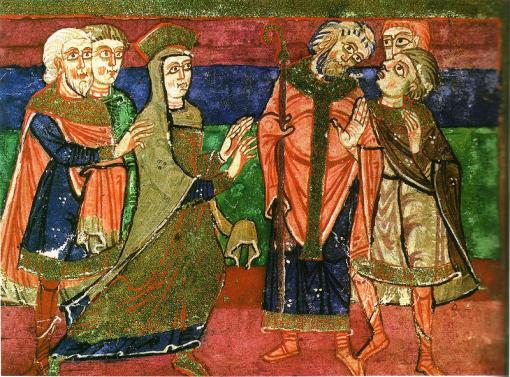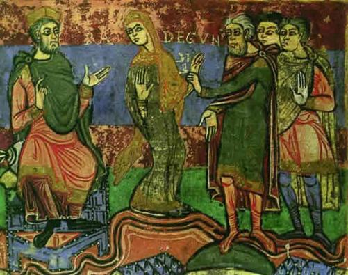 Radegonde menée auprès du roi Clotaire. Vie de sainte Radegonde, XIe siècle. Bibliothèque municipale de Poitiers