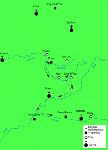 Quelque temps après, Radegonde est emmenée dans le royaume de Soissons, à Saint-Quentin, puis dans une villa royale située à Athies, dans le Vermandois.