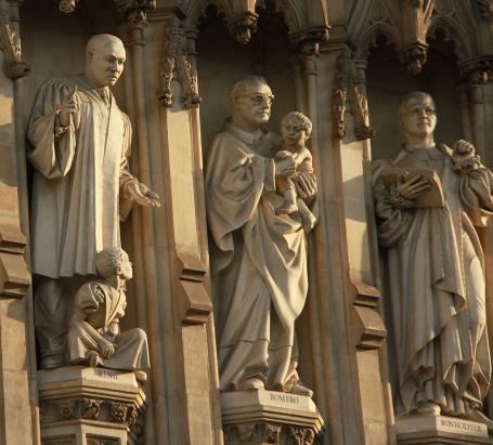 Statue d'Oscar Romero portant un enfant, parmi les neuf autres Martyrs de l'abbaye de Westminster