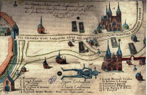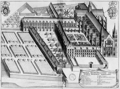 La basilique (no 10 en bas à droite) en dessous de l'église saint-Nicaise, dessin de 1666