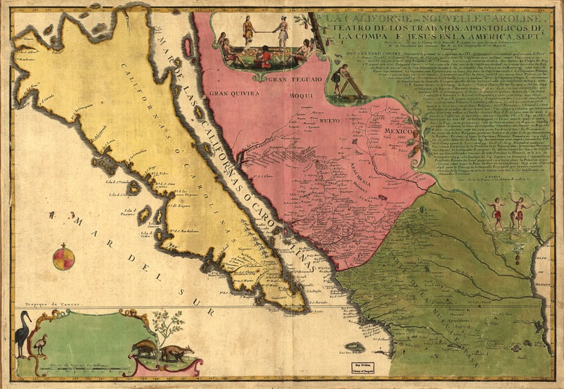 Cette carte, qui a été coloriée à la main par le cartographe Nicolas de Fer, a été créée à l'origine par Kino en 1696. L'endroit est appelé la Californie ou Nouvelle Caroline:. Lieu des Travaux apostoliques de la Compagnie de Jésus à l'Amérique Septentrionale'