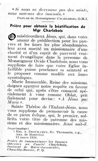 On ouvrit un dossier pour sa béatification le 16 septembre 1979. En 1978, l’Archidiocèse de Keewatin-Le Pas, au Canada, dont le premier évêque a été Mgr. Ovide CHARLEBOIS, plaide en faveur de sa canonisation; cette cause fut introduite officiellement à Rome, en 1986.