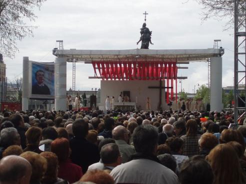 Un moment de la cérémonie de béatification à Valladolid , avec le monument à Christophe Colomb en arrière-plan.