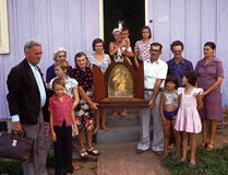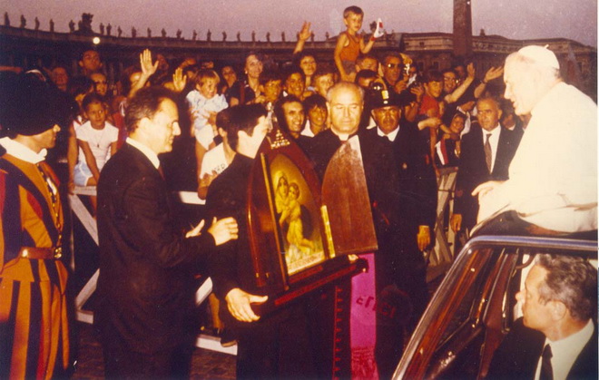 Le Pape Jean Paul II bénit l'icône pèlerin de Jean Pozzobon, en 1984