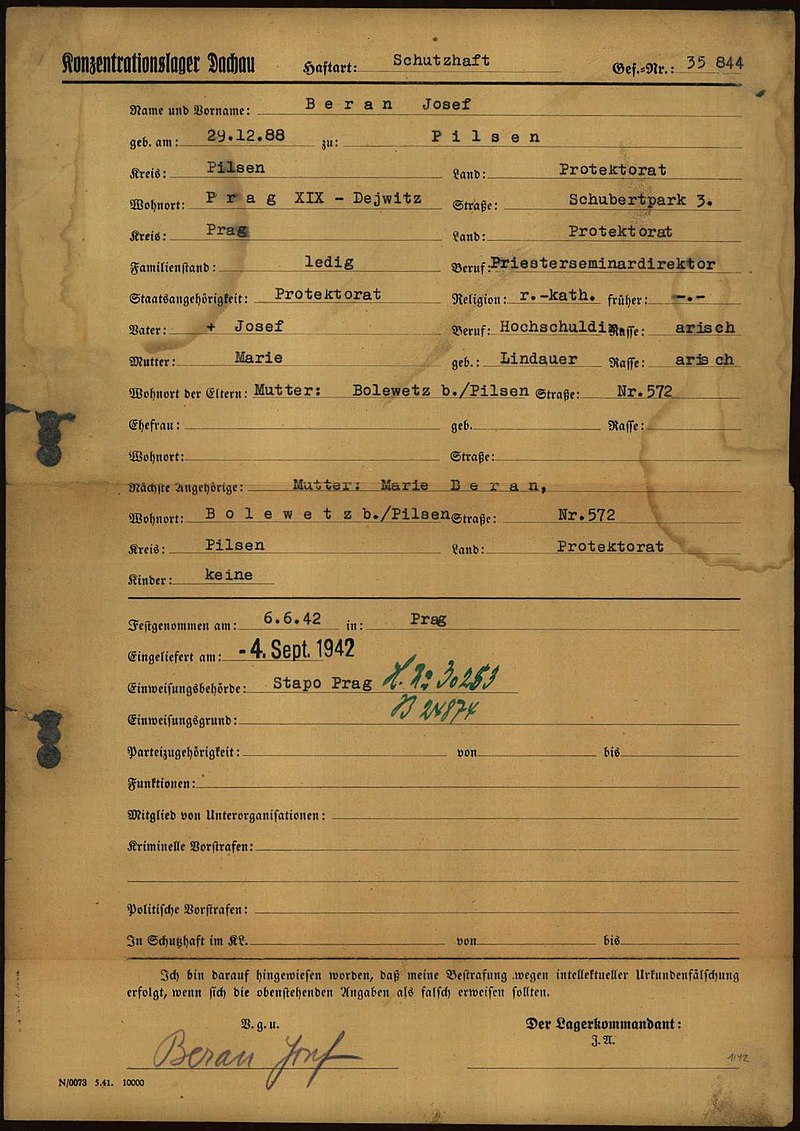 Formulaire d'enregistrement de Josef Beran en tant que prisonnier dans le camp de concentration nazi de Dachau