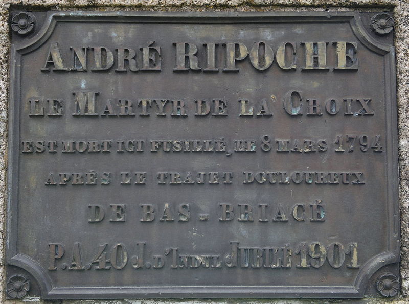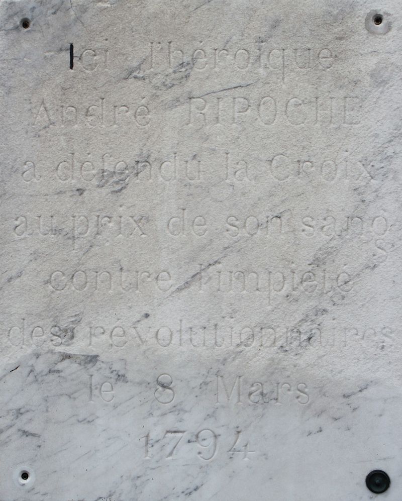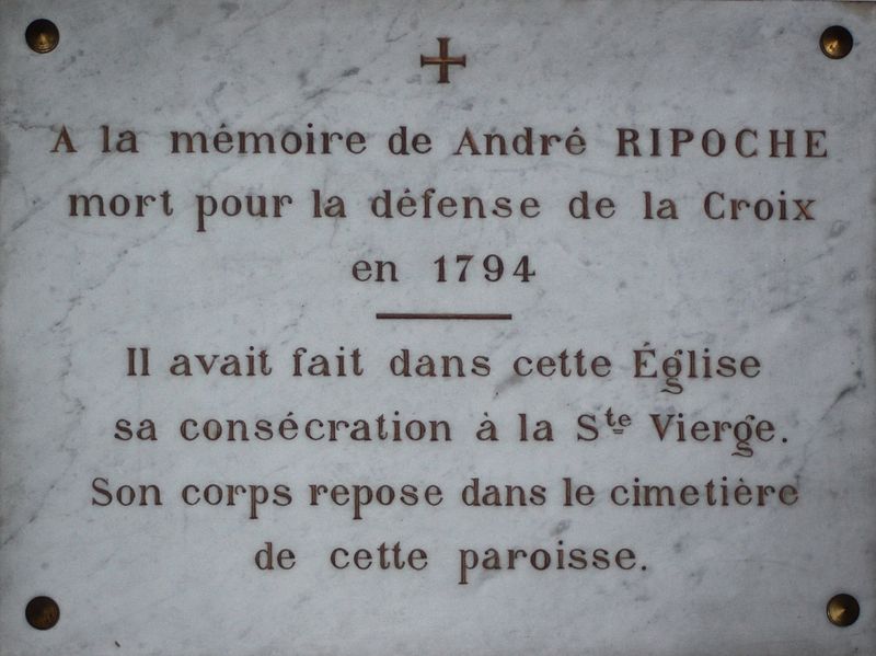 - 19 novembre 1899 : nouvelle bénédiction de la croix et de la plaque gravée « Ici, l'Héroïque André Ripoche a défendu la Croix au prix de son sang, contre l'impiété des Révolutionnaires, le 8 mars 1794 » ;