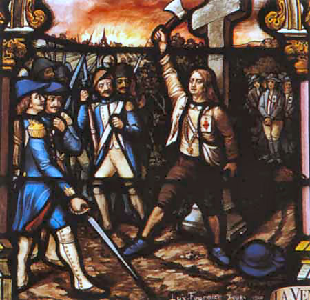 - Le chef des Bleus dit alors : « Infâme brigand ! Les tiens et toi allez être fusillés !!! Mais je t'offre cependant un moyen de racheter ta vie : consens à abattre cette croix et à marcher ensuite sur cet emblème de la superstition, et tu seras immédiatement rendu à la liberté ! ».
